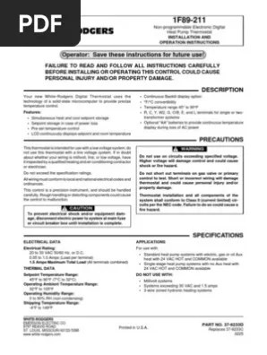 White Rodgers 1F89 211 Manual / White Rodgers 1f89 211 80 Series Heat Pump Thermostat Installation And Operation Instructions 1f89 211 37 6233g :. Save these instructions for future use! Blue 2" heat pump thermostat heat pump installation and operating instructions save these instructions for future use! Failure to do so could cause a fire hazard. Large lcd with improved contrast for easier . To see the manufacturer's warranty statement, click on the manuals tab.